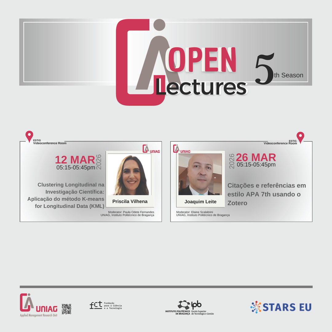 No âmbito das atividades da UNIAG e dos Mestrados em Gestão das Organizações e Contabilidade e Finanças, tem início hoje, dia 12 de março, pelas 17h15, a 5.ª edição das Open Lectures, que terá lugar na Sala de Videoconferência (Biblioteca da ESTiG).